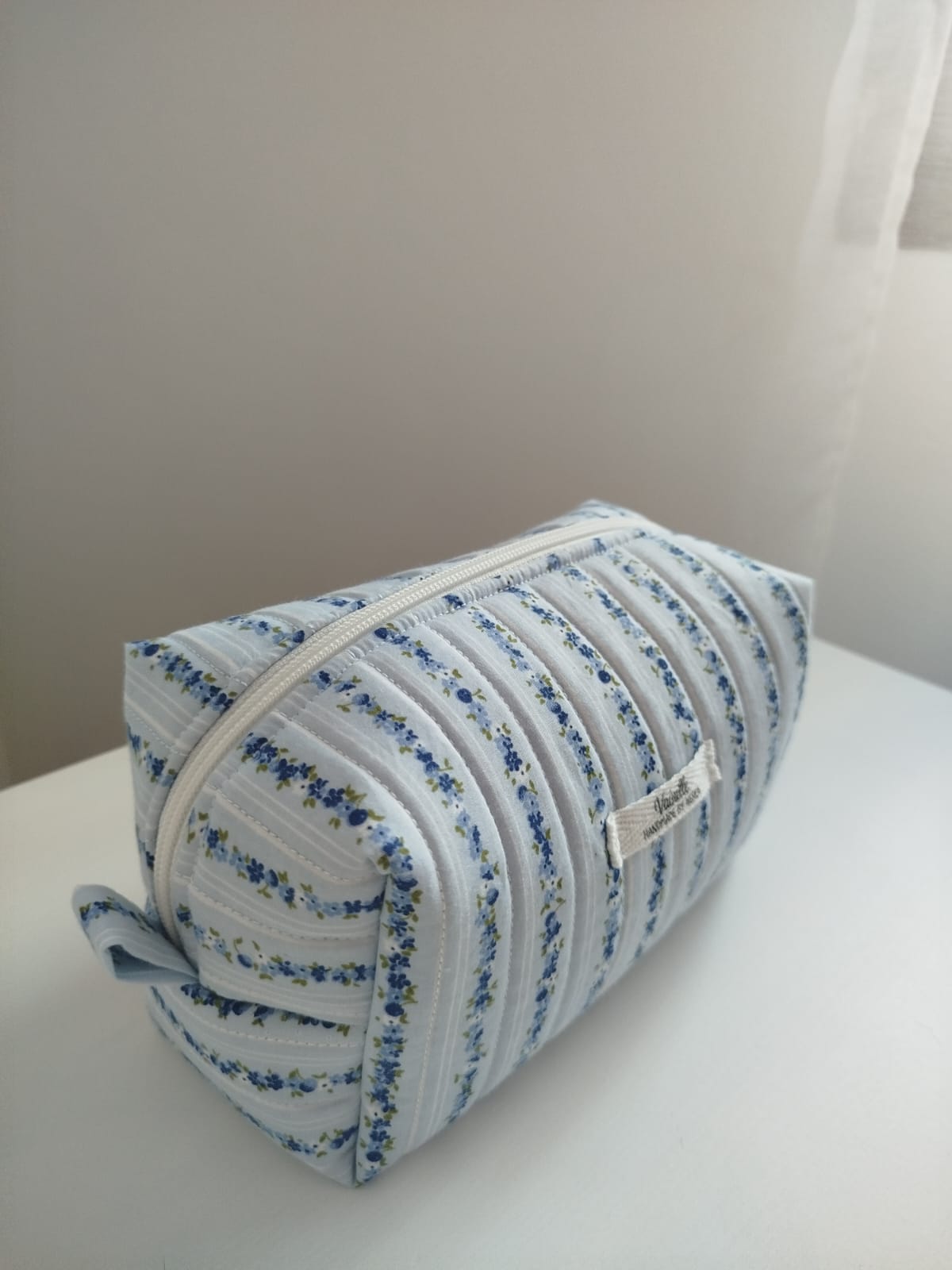 Neceser de color azul cielo, con estampado de flores más oscuras, acolchado vertical, con forro blanco o de la misma tela. También se pueden personalizar.