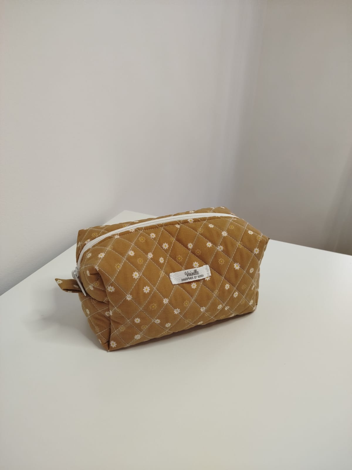 Neceser de color ocre con estampado de flores, acolchado diagonal, y con forro de la misma tela o blanco. También se pueden personalizar.