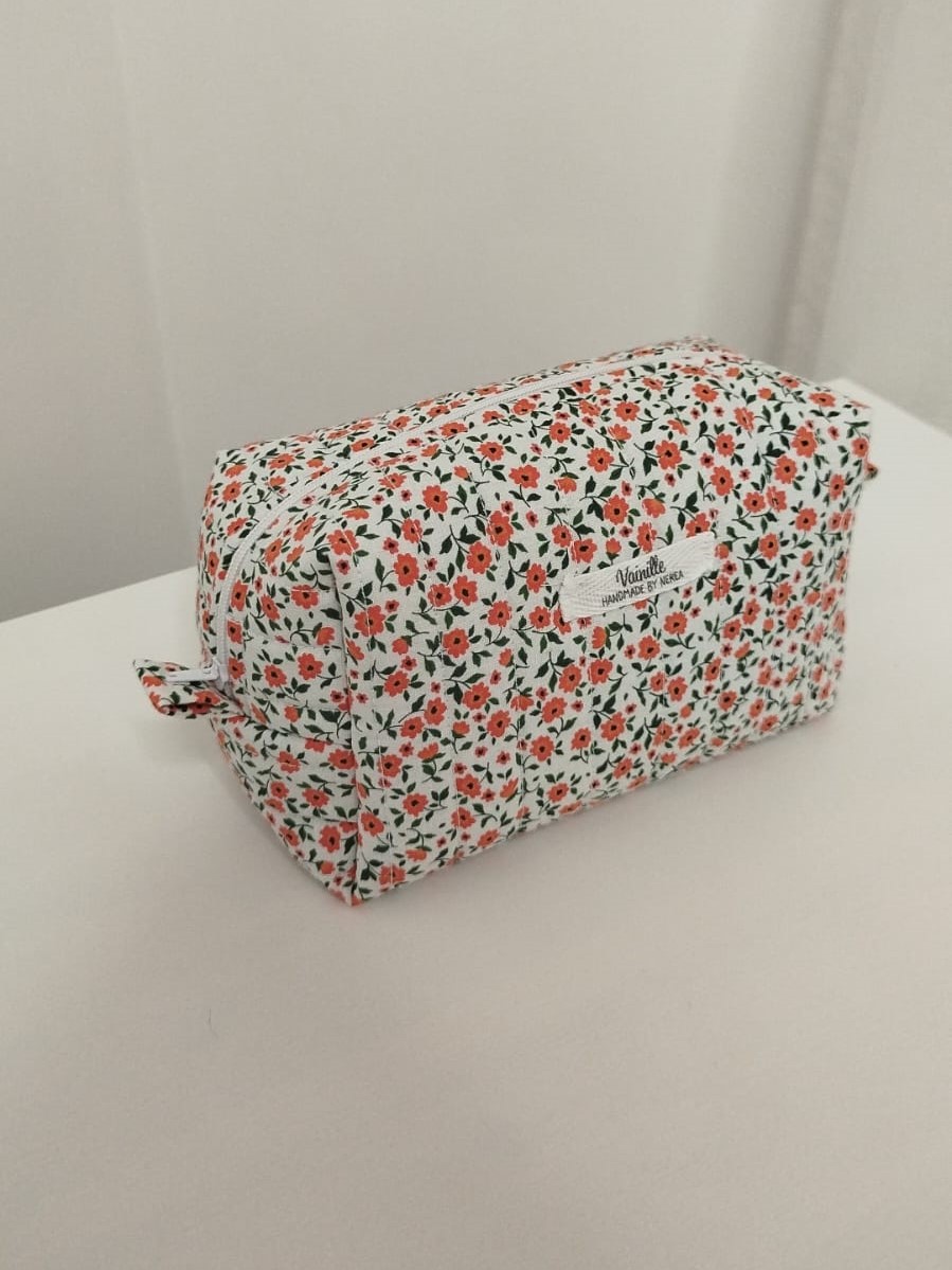 Neceser con estampado de flores naranjas sobre fondo blanco, acolchado vertical, con forro de la misma tela. También se pueden personalizar.