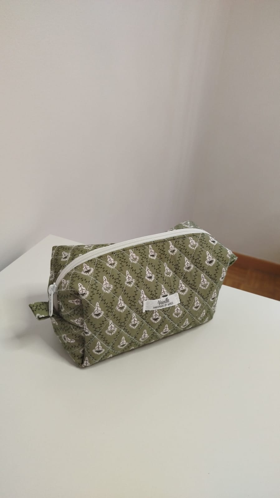 Neceser verde con estampados blancos, acolchado diagonal, con forro de la misma tela o blanco. También se pueden personalizar.