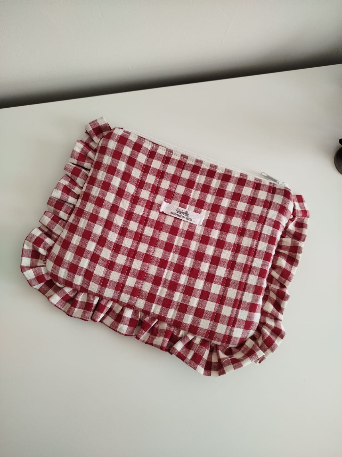 Neceser plano con volantes y con estampado de cuadros rojos y blancos, acolchado vertical, con forro blanco o de la misma tela. También se pueden personalizar.