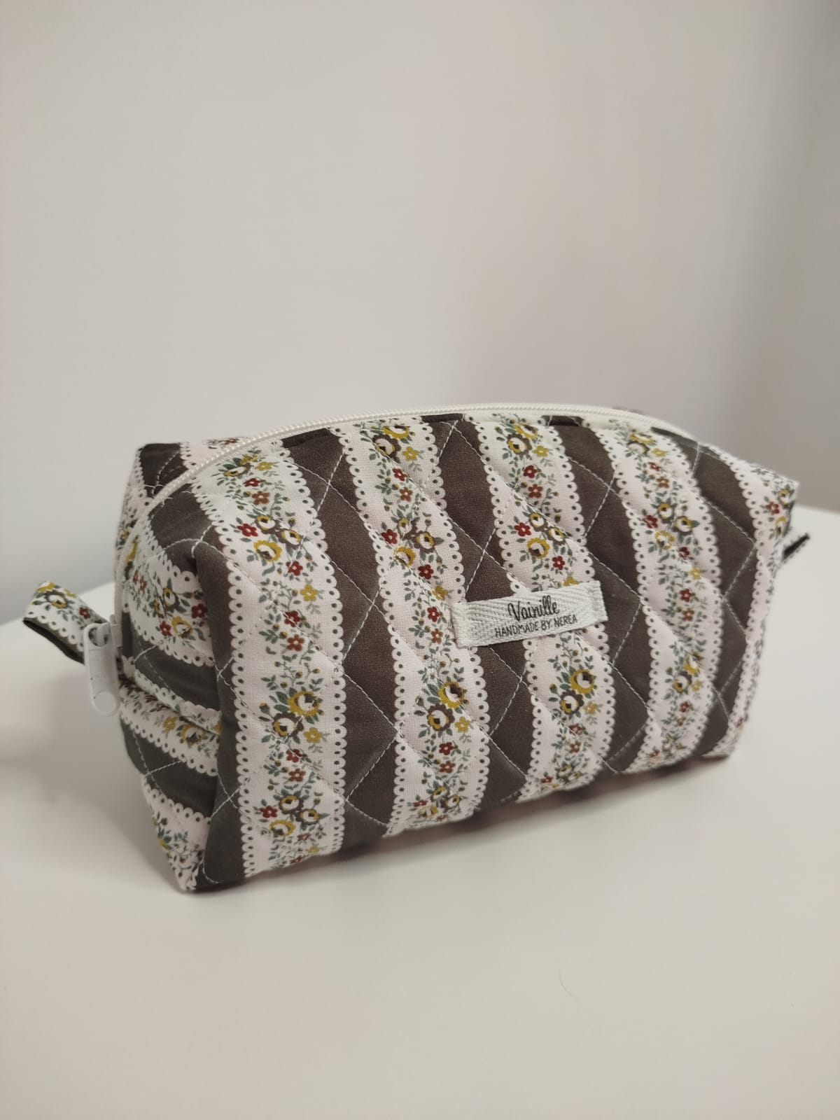 Neceser con estampados florales con color verde militar, acolchado diagonal, y con el forro del mismo estampado o blanco. También se pueden personalizar.